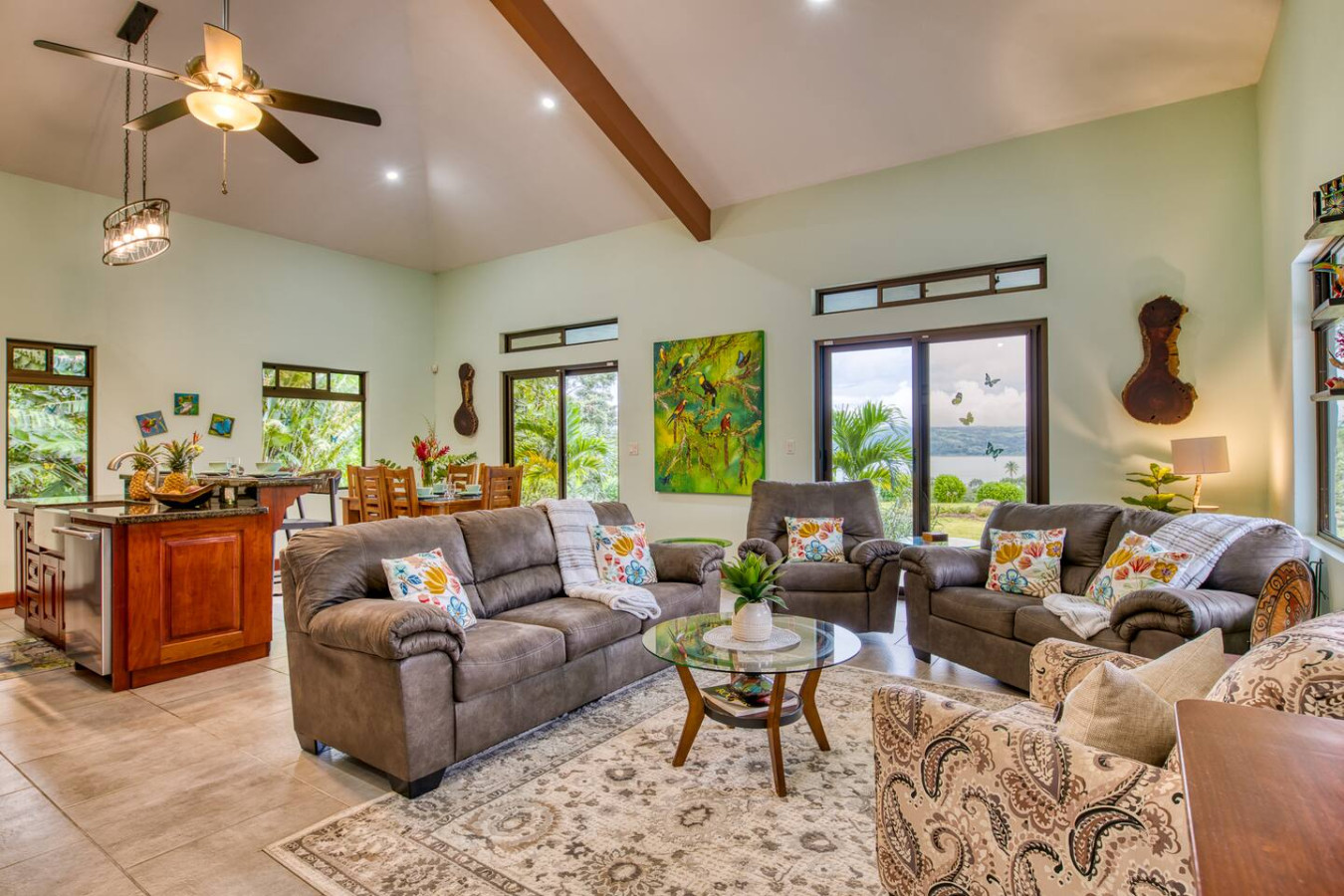 Our fully equipped kitchen offers the ideal setting for preparing delicious meals, while gazing out at the breathtaking views of Lake Arenal and the majestic Arenal Volcano through the patio doors. When it's time to dine, you can choose between the indoor dining room table or the outdoor patio table surrounded by twinkling lights.